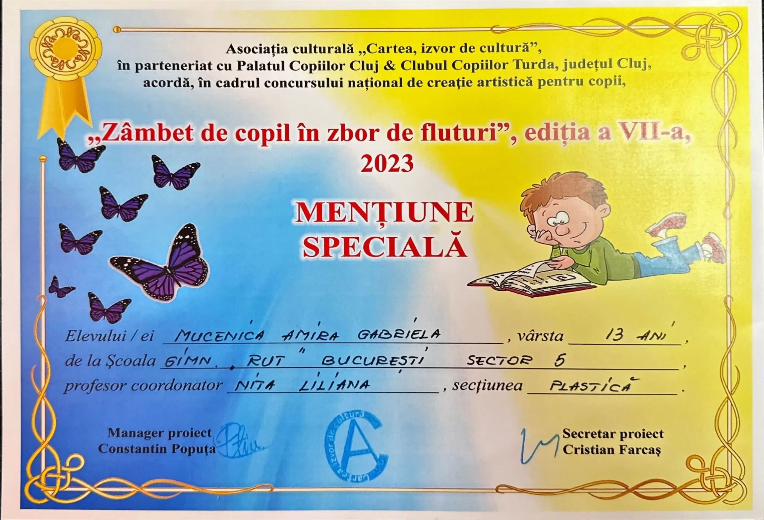 La ediția a VII-a (2023) a concursului național de creație artistică „Zâmbet de copil în zbor de fluturi” organizat de Asociația culturală „Cartea, izvor de cultură”, s-au trimis lucrări artistice din partea a 20 de copii, iar la secțiunea „plastică” s-a acordat premiul mențiune specială elevei Mucenica Amira.