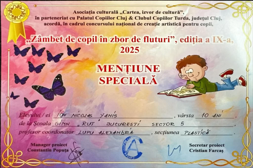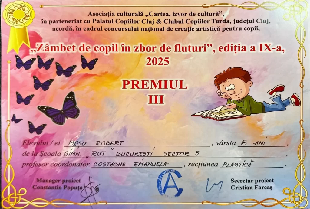 Toți elevii, care au contribuit cu lucrări pentru participarea la ediția a IX-a a Concursului național de creație artistică „Zâmbet de copil în zbor de fluturi”, au realizat lucrări deosebite. În urma acestei participări, doi elevi au obtinut premiul III și mențiune specială. Totodată îi felicităm și pe ceilalți nouă participanți din partea Școlii Rut, cărora li s-au acordat diplome de participare și le dorim tuturor să își dezvolte talentele pentru și mai multe reușite🙂.